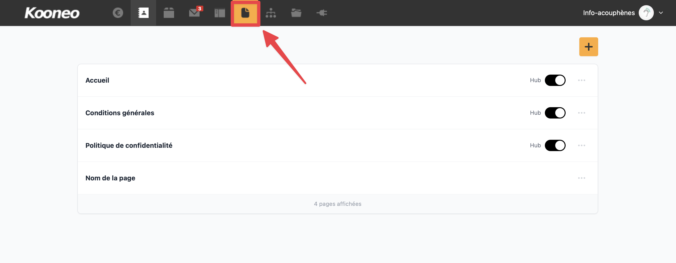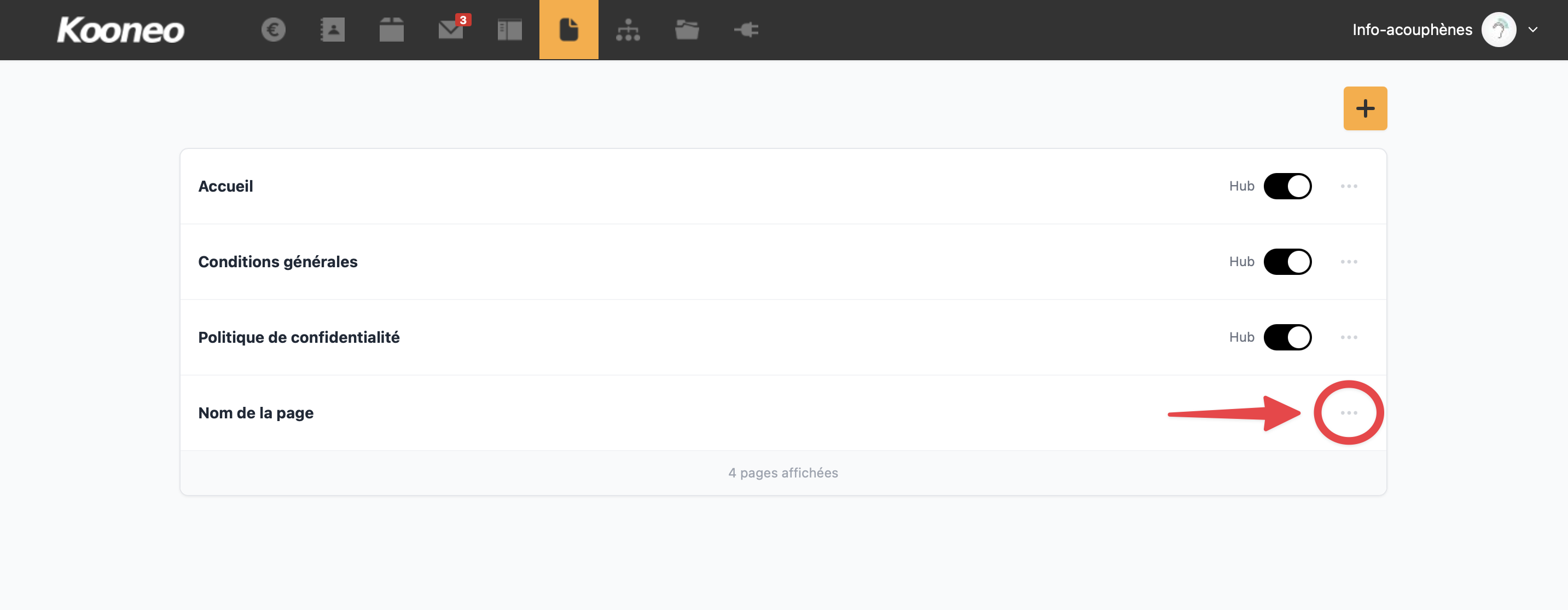 Cette action vous permet d’afficher et de gérer la liste des pages de votre site, comme l’accueil, les conditions générales ou la politique de confidentialité.