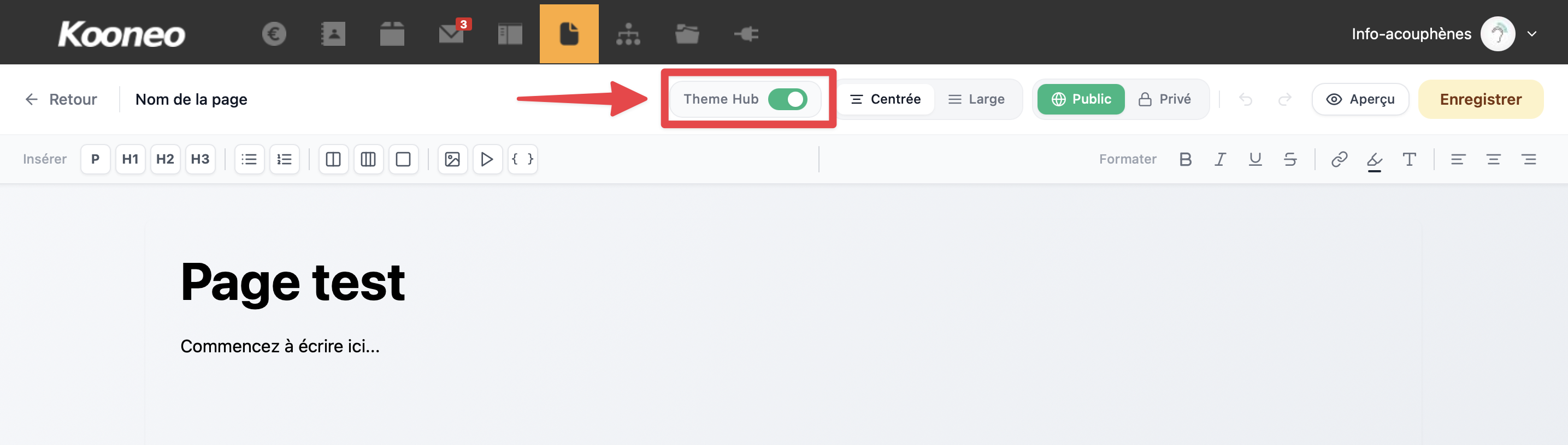 - Activez Theme Hub si vous souhaitez utiliser le thème graphique de votre Hub Kooneo
