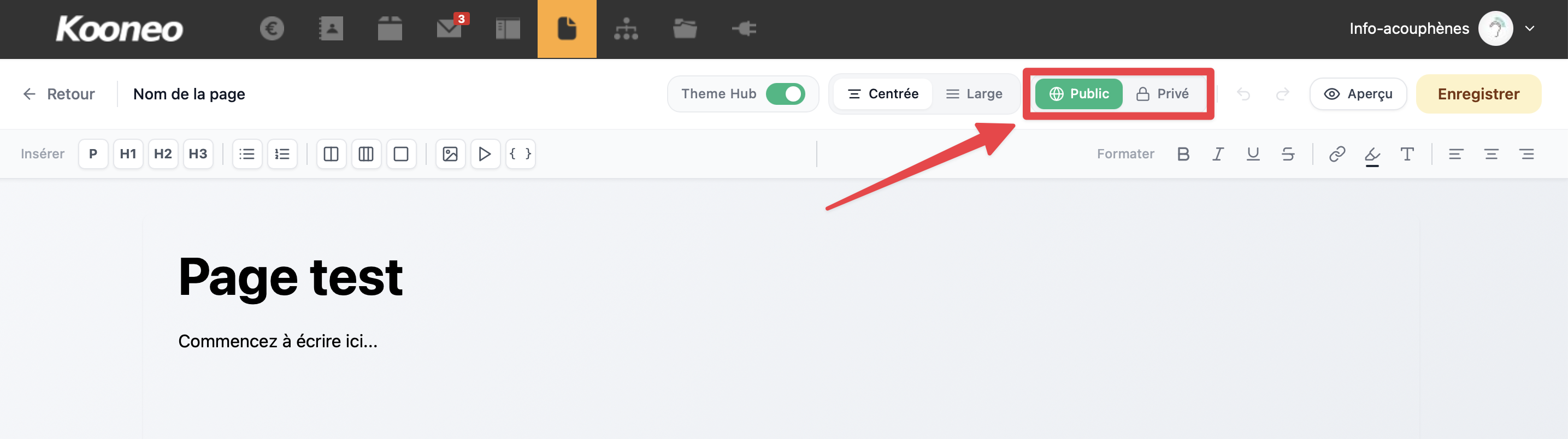 - Sélectionnez Public pour rendre la page visible par tous