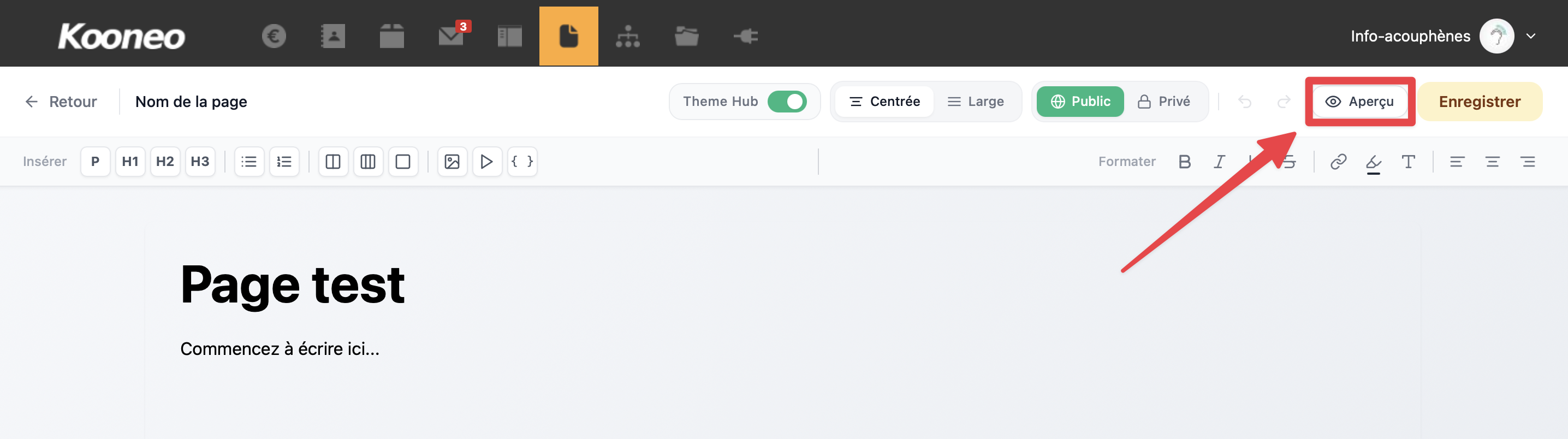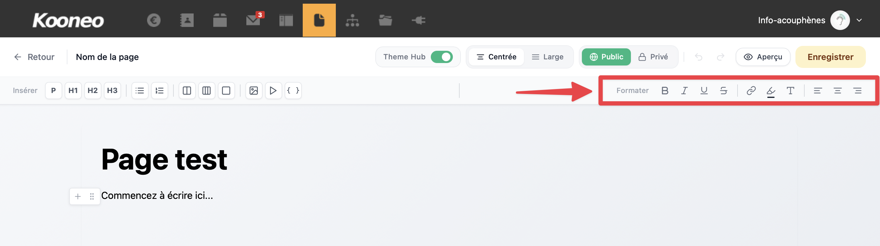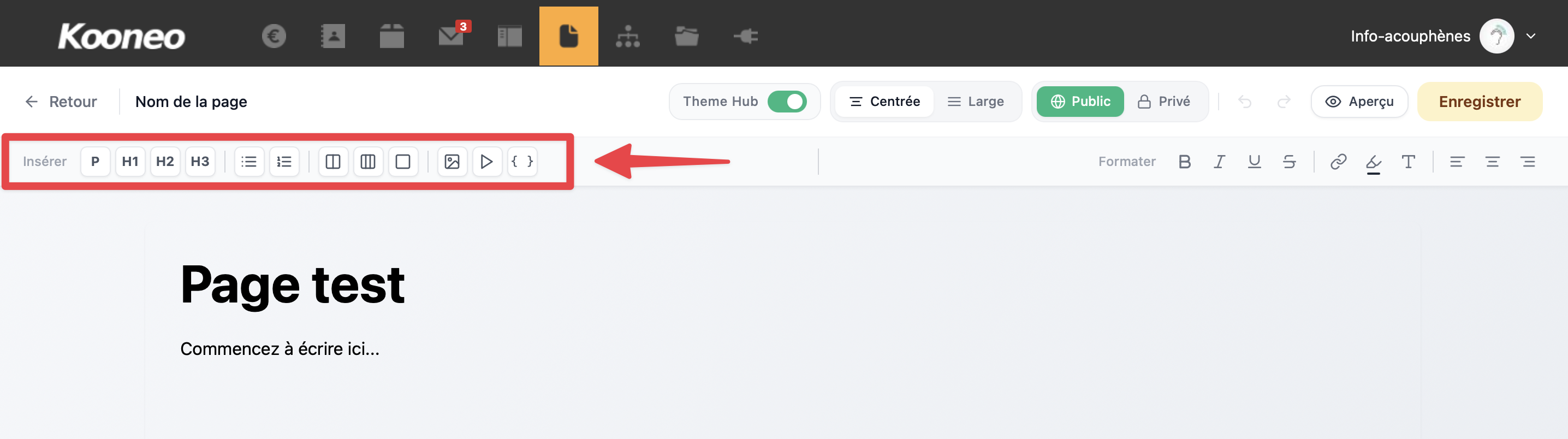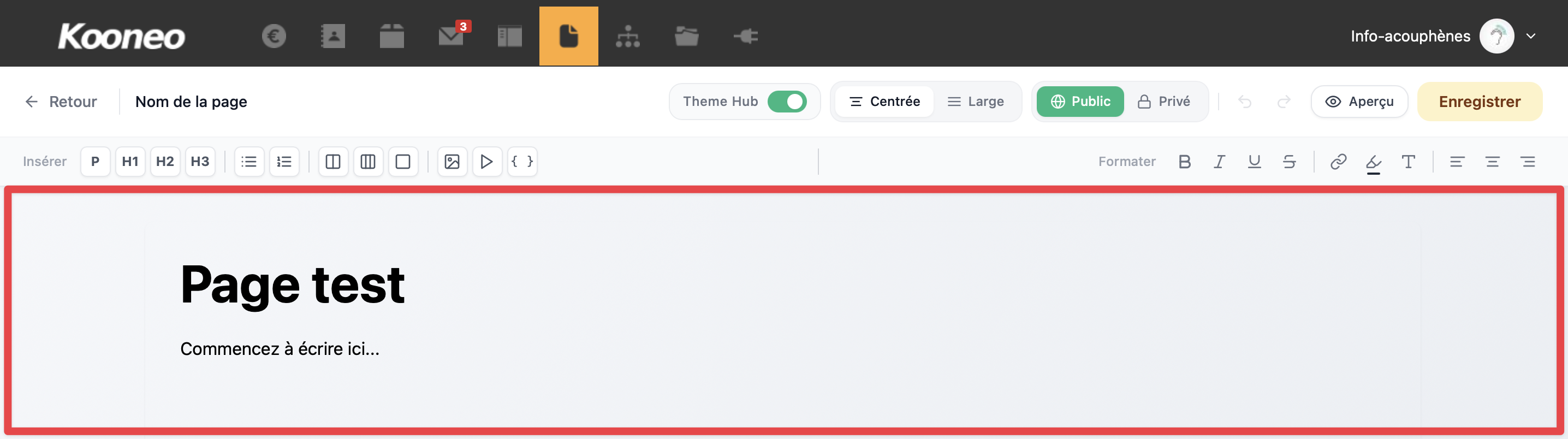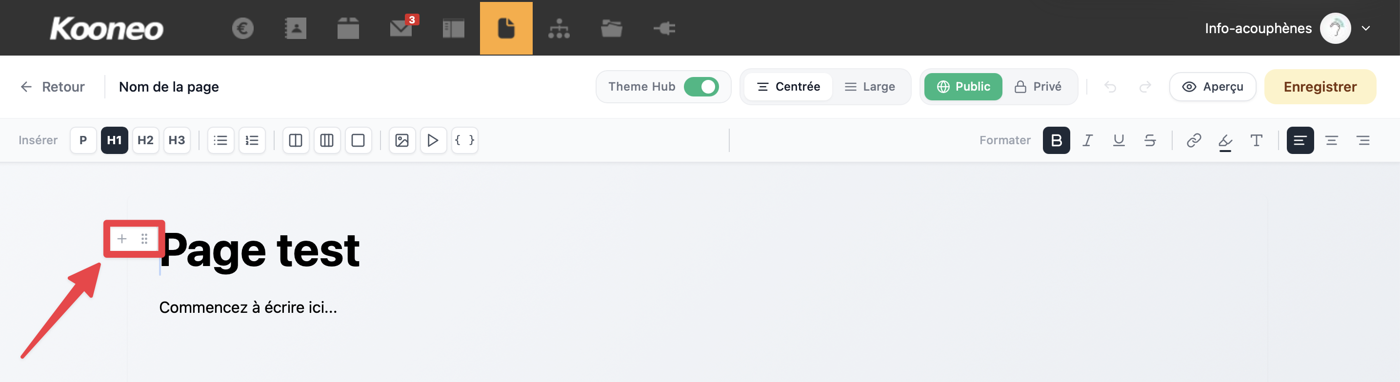 Cette zone vous permet de construire le contenu de votre page en ajoutant du texte et des blocs selon la structure souhaitée.