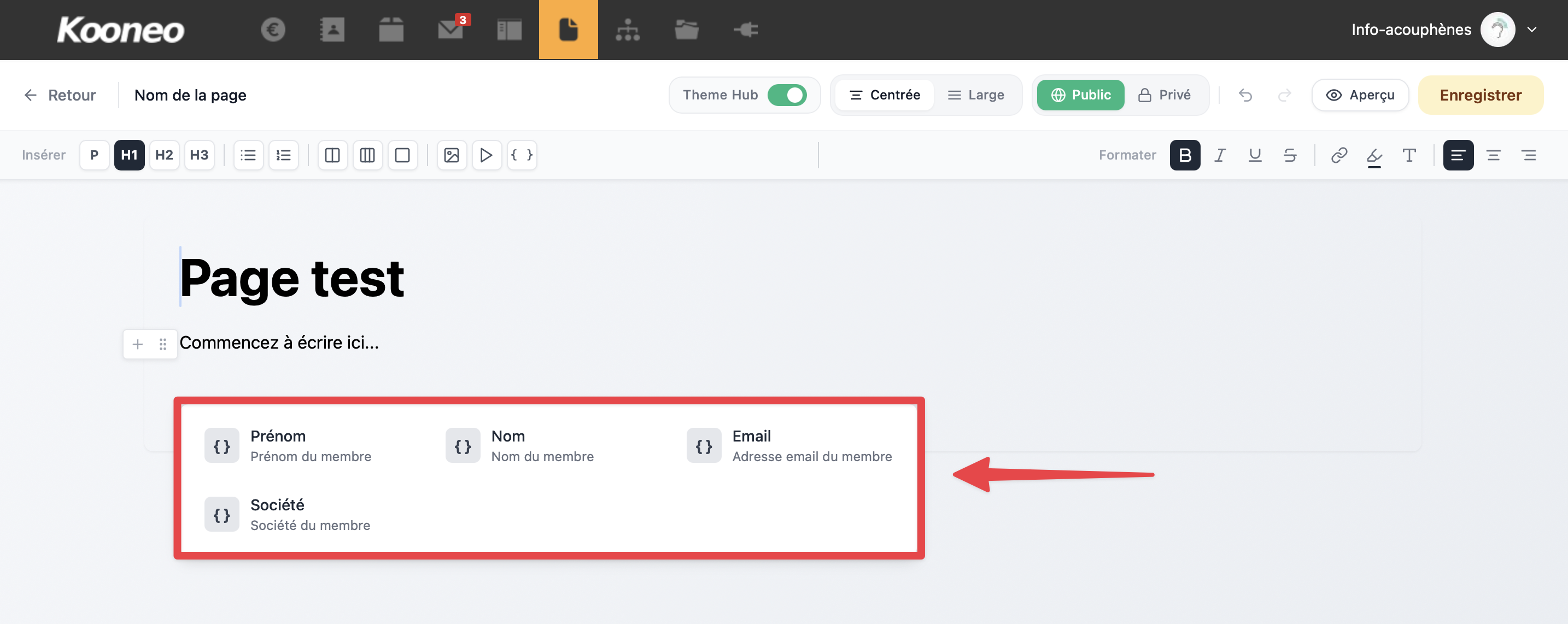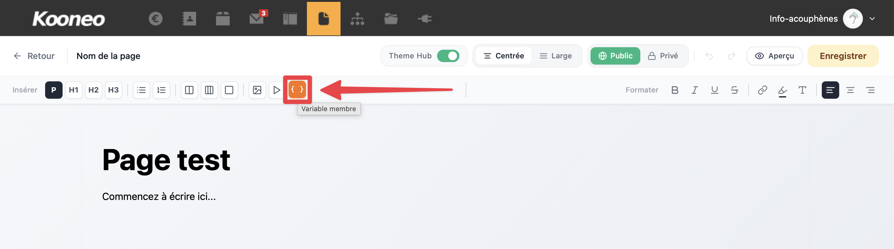 Cette liste affiche les variables actuellement disponibles que vous pouvez insérer dans votre page. D’autres variables seront ajoutées ultérieurement.