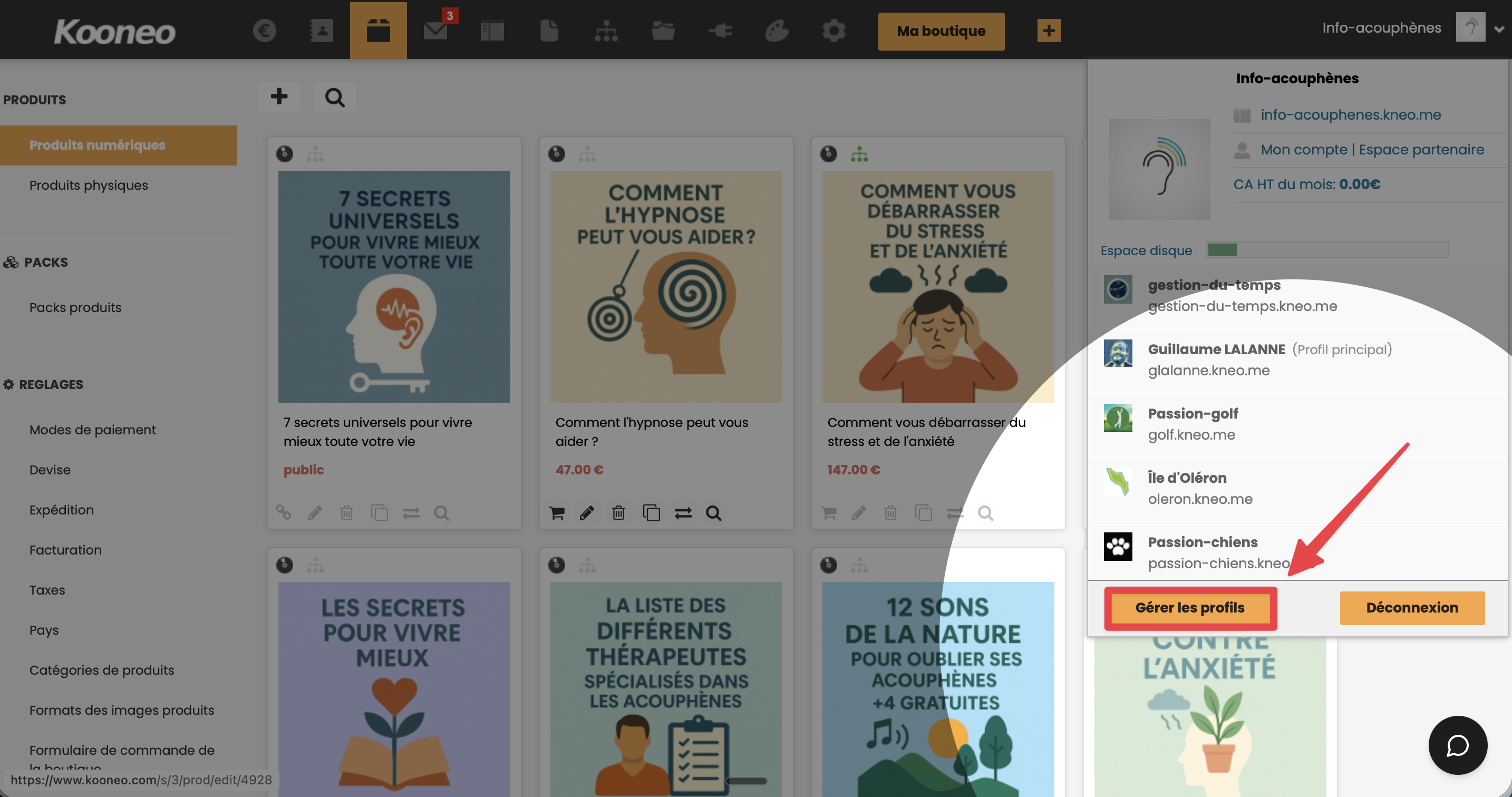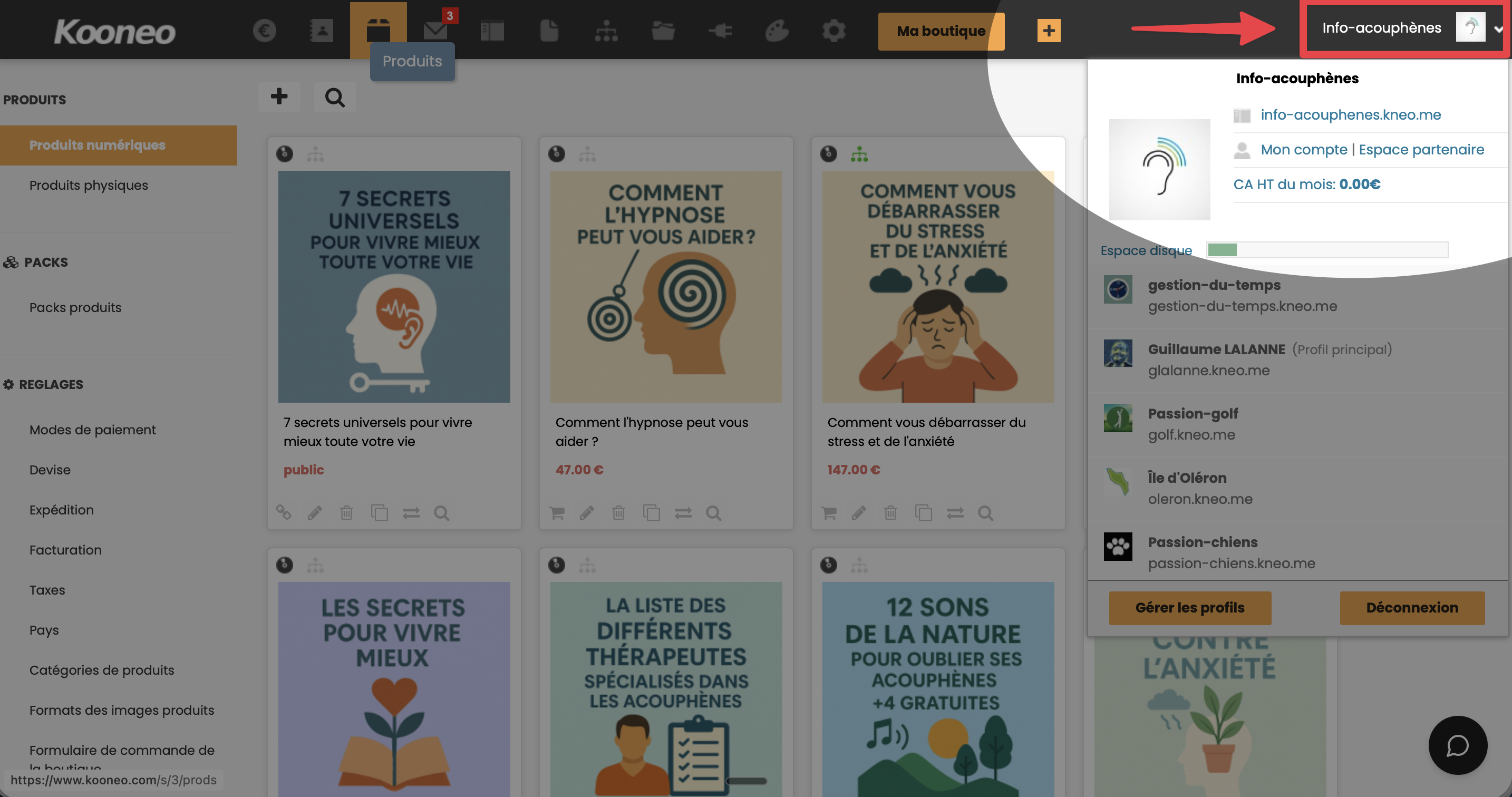 Un panneau s'ouvre avec les informations de votre profil actif : l'adresse de votre site, l'accès à votre compte et à l'espace partenaire, votre chiffre d'affaires HT du mois, l'espace disque utilisé, ainsi que la liste de vos autres profils. Vous pouvez depuis ce panneau basculer facilement entre vos différents profils ou gérer leurs paramètres.