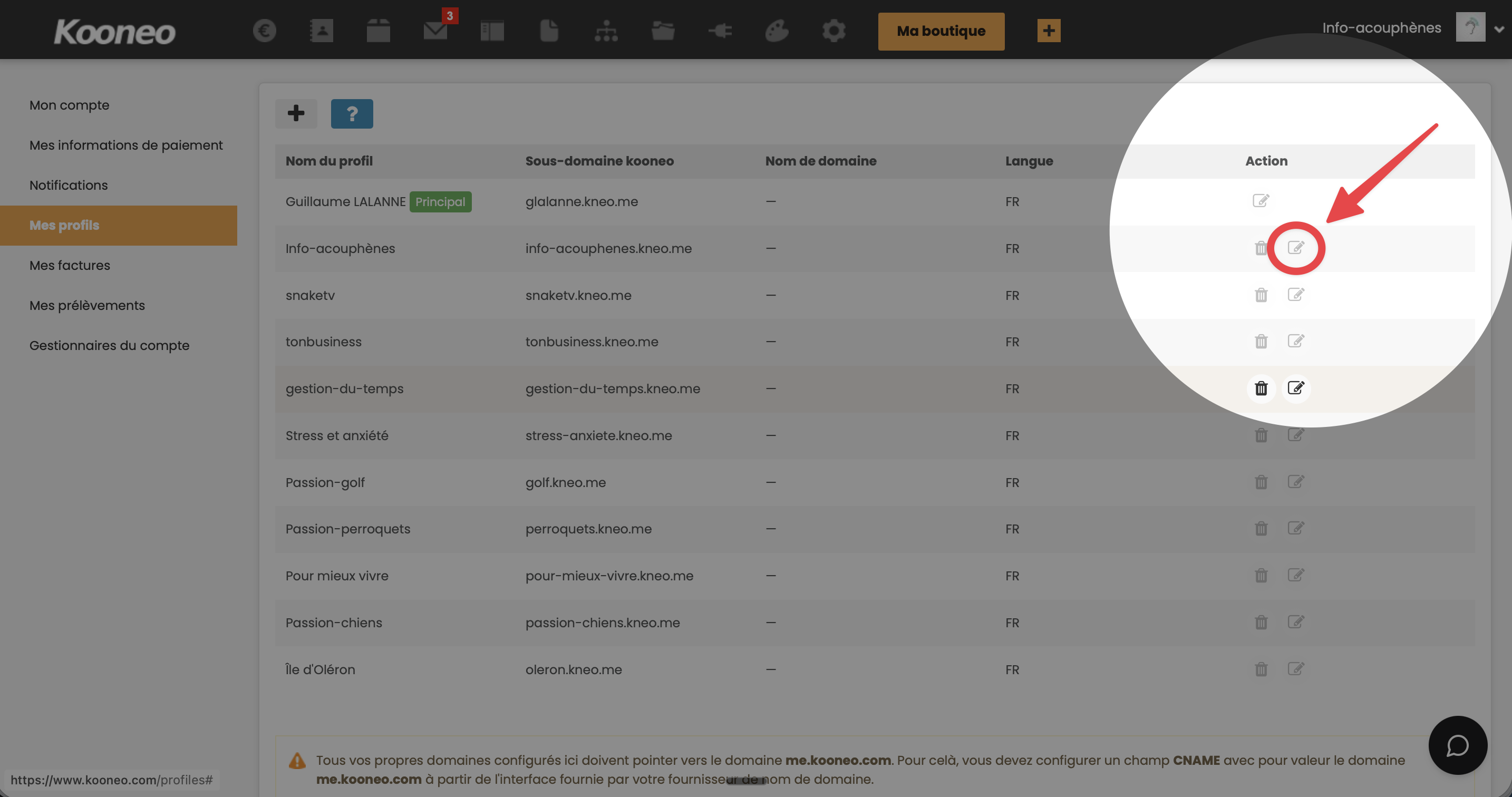 Cette option vous permet d'accéder à la gestion centralisée de tous vos profils. Vous pouvez ainsi modifier, organiser ou supprimer vos différents profils depuis un seul endroit.