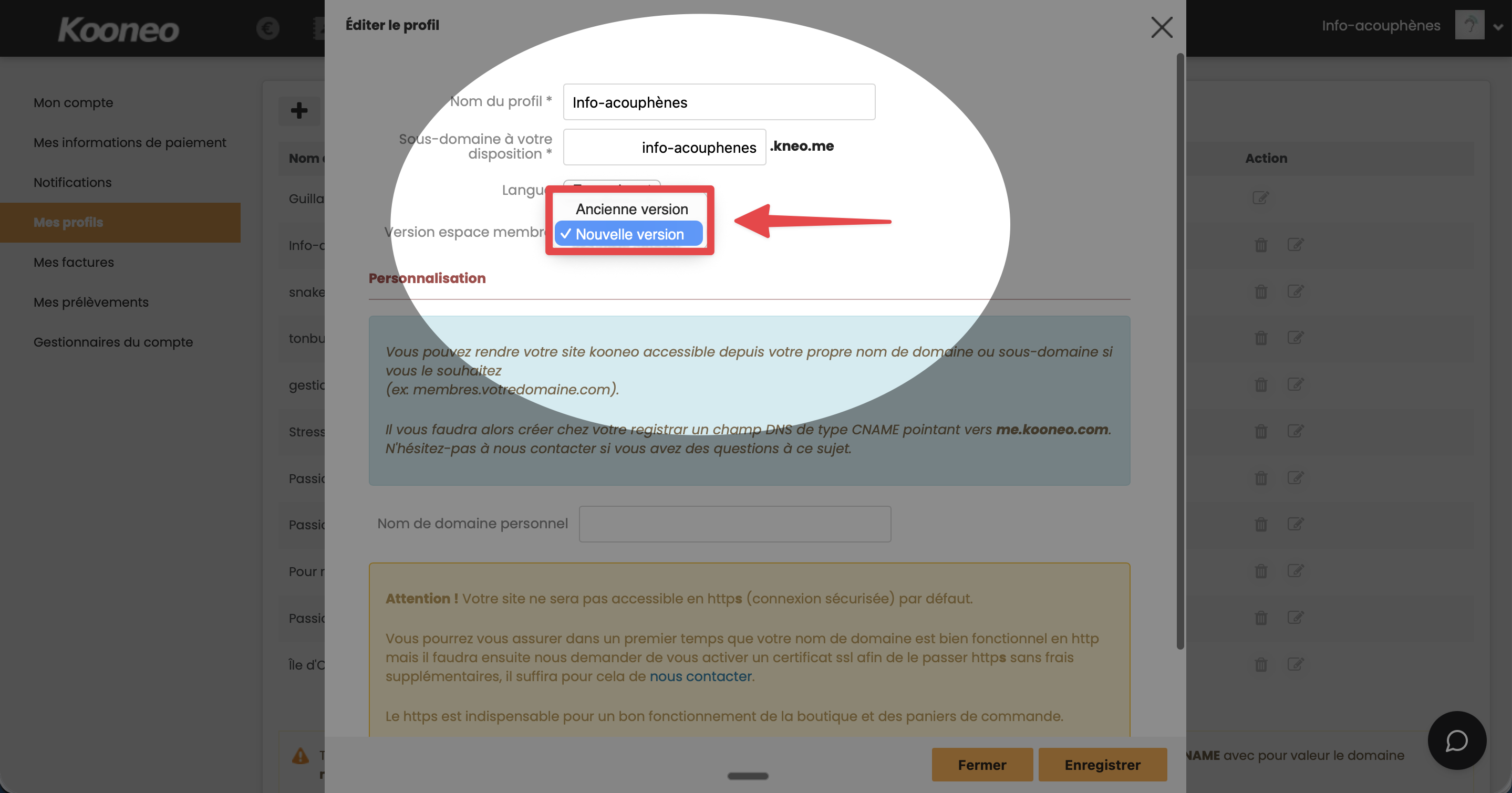 - Sélectionnez la nouvelle version de l'espace membre