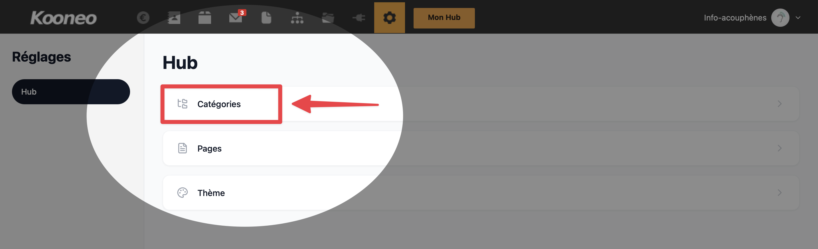 Cette action permet d’ouvrir la section dédiée aux catégories du Hub afin de les consulter et de les gérer.