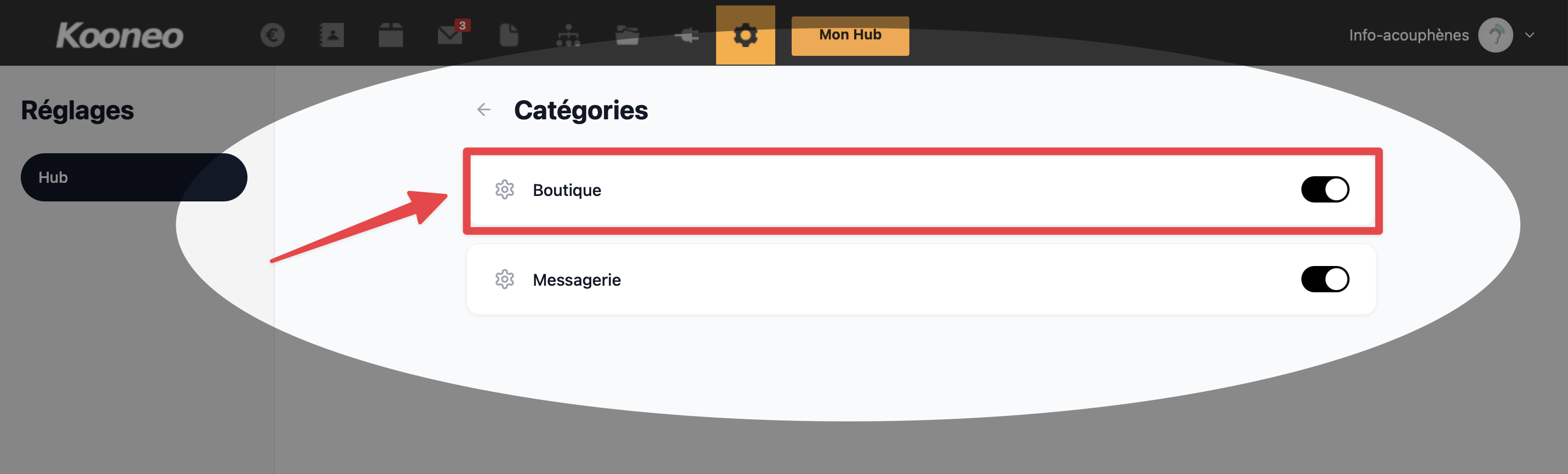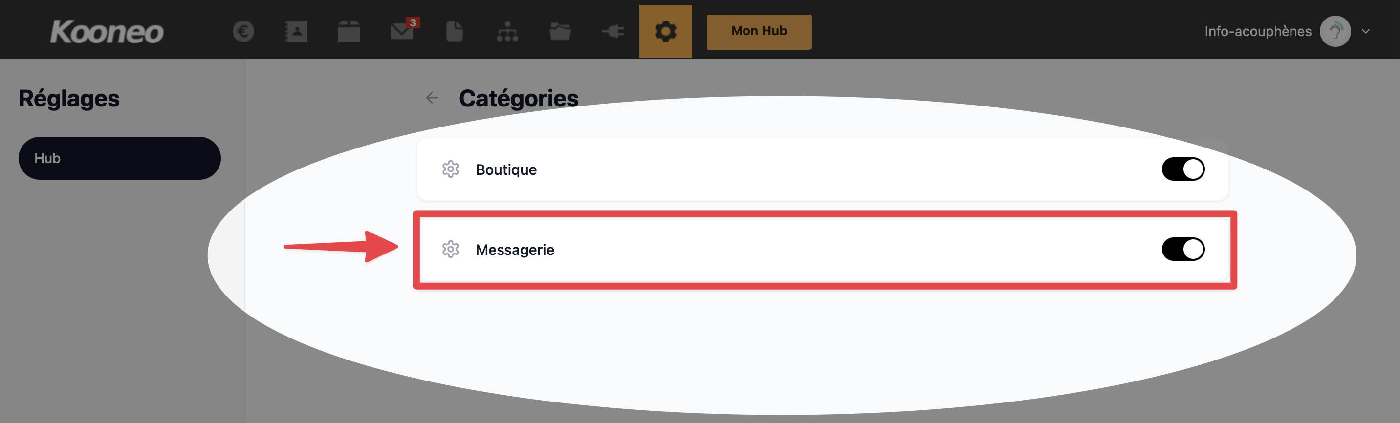Cette option permet de choisir si la messagerie est visible ou non sur votre Hub, afin d’adapter les fonctionnalités affichées à vos besoins.