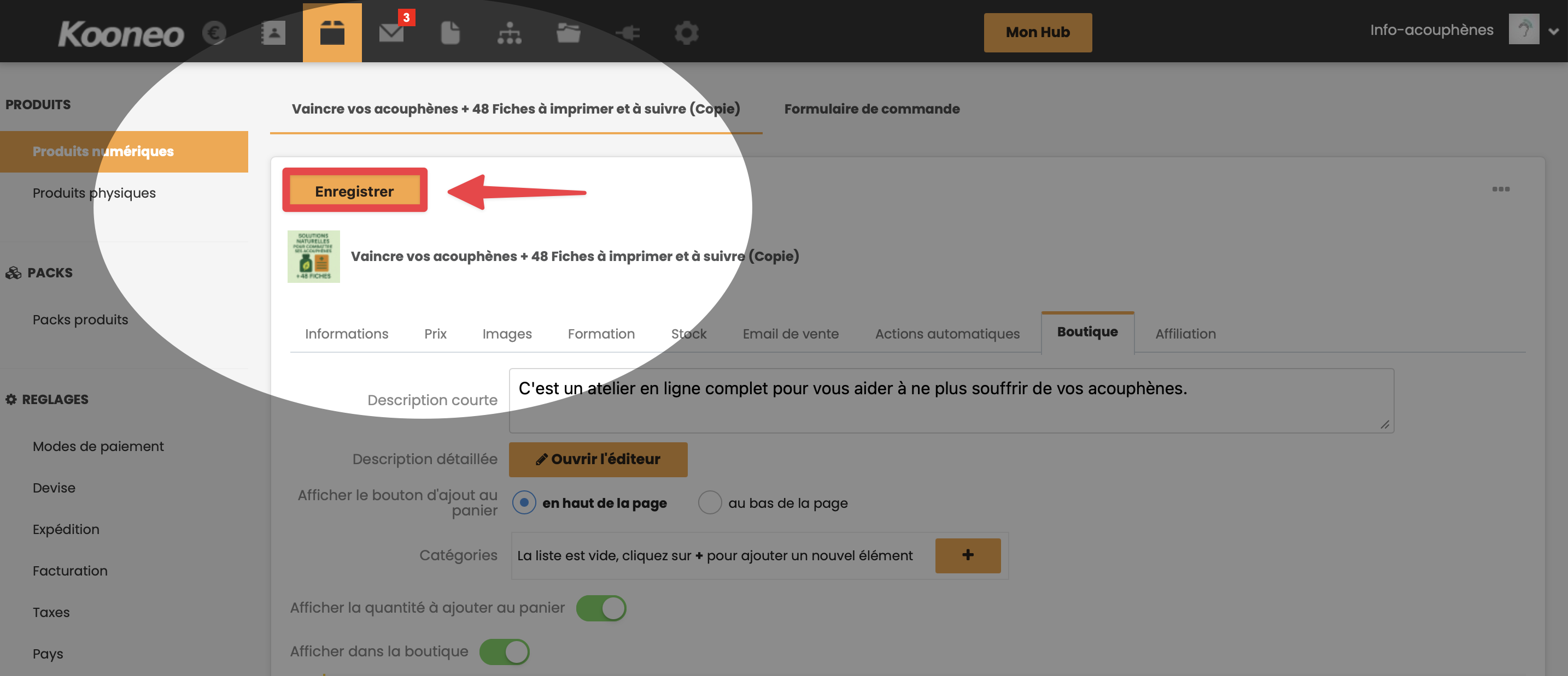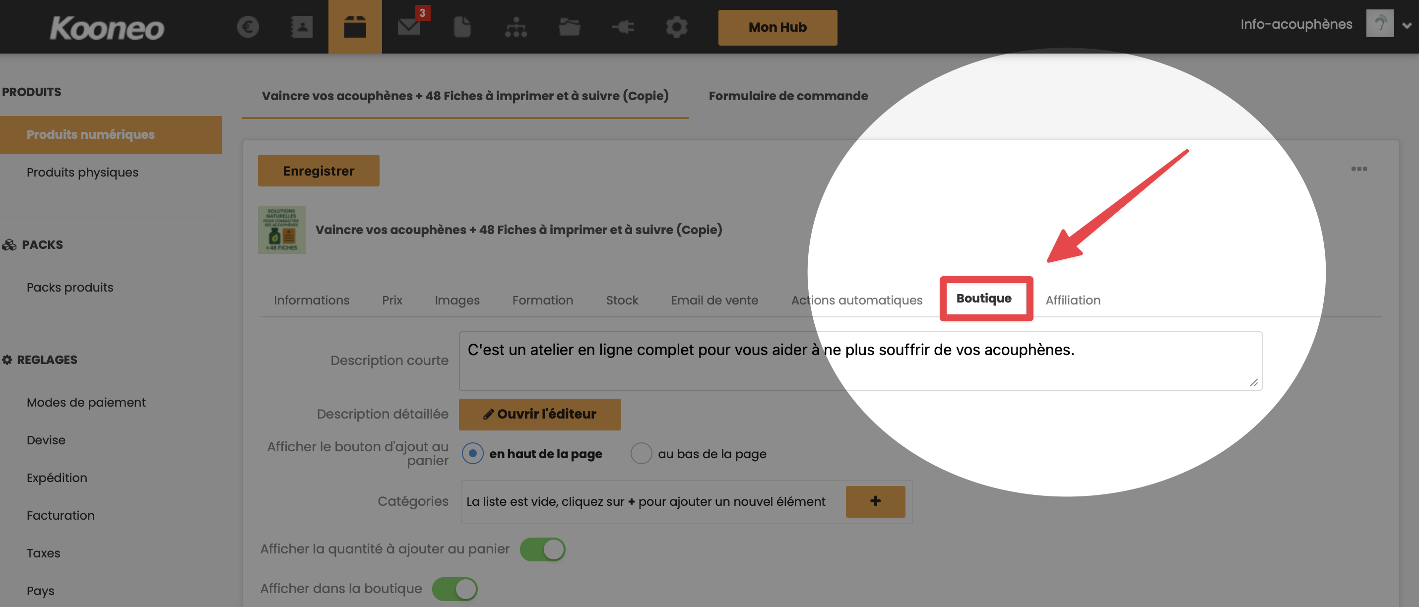 - Cliquez sur l’onglet Boutique dans la configuration de votre produit numérique.