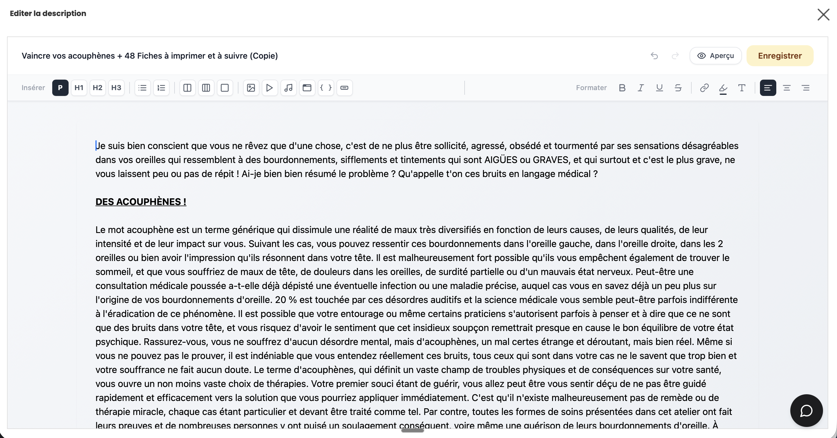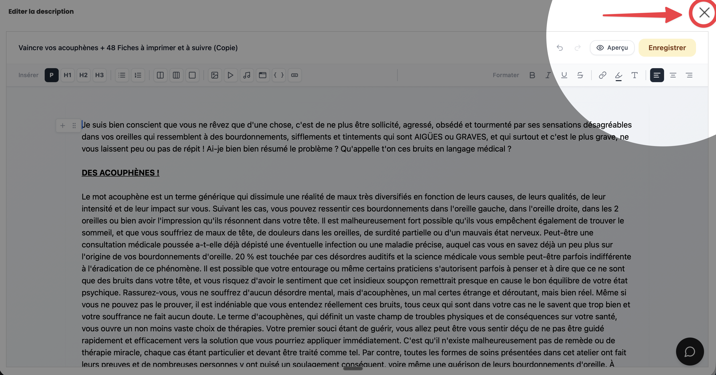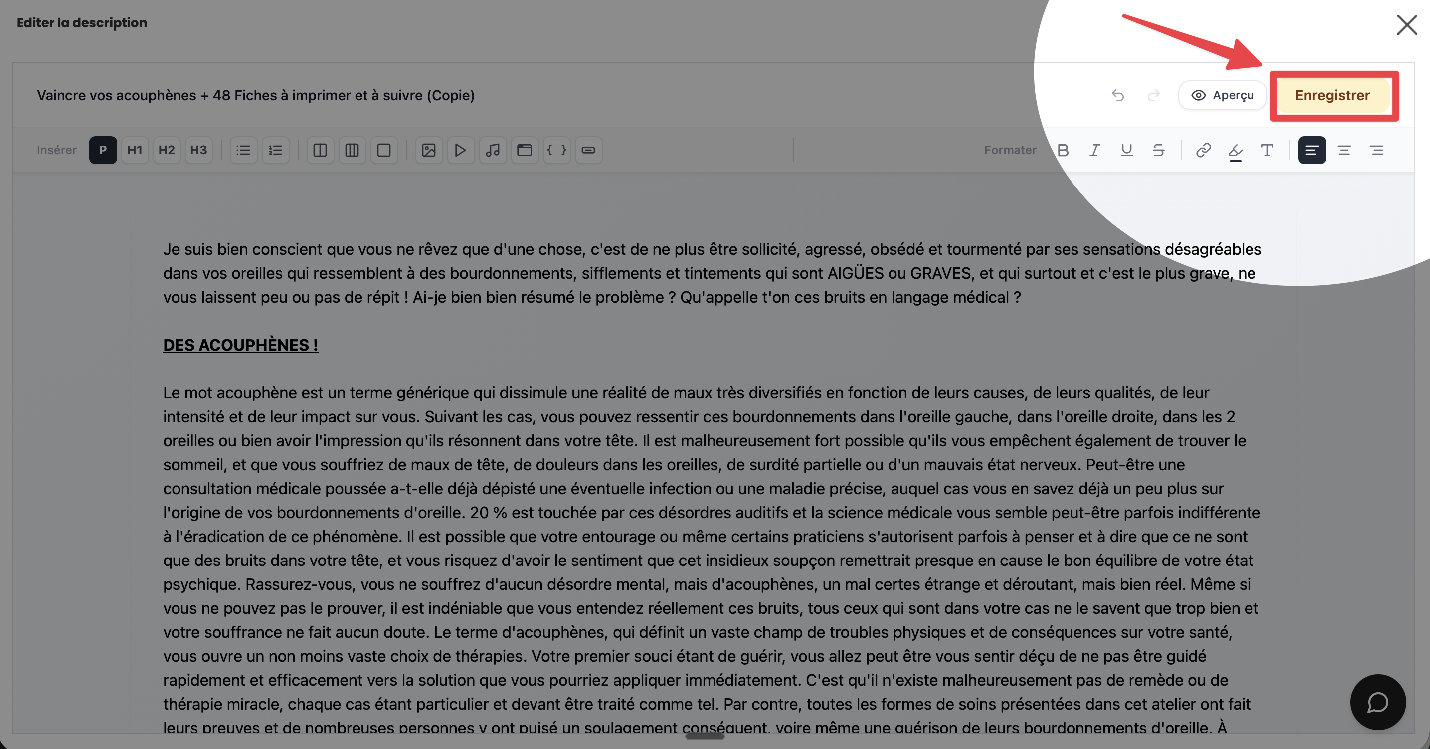 Cette action permet de sauvegarder les modifications apportées au contenu afin qu’elles soient prises en compte dans la description affichée dans la boutique.