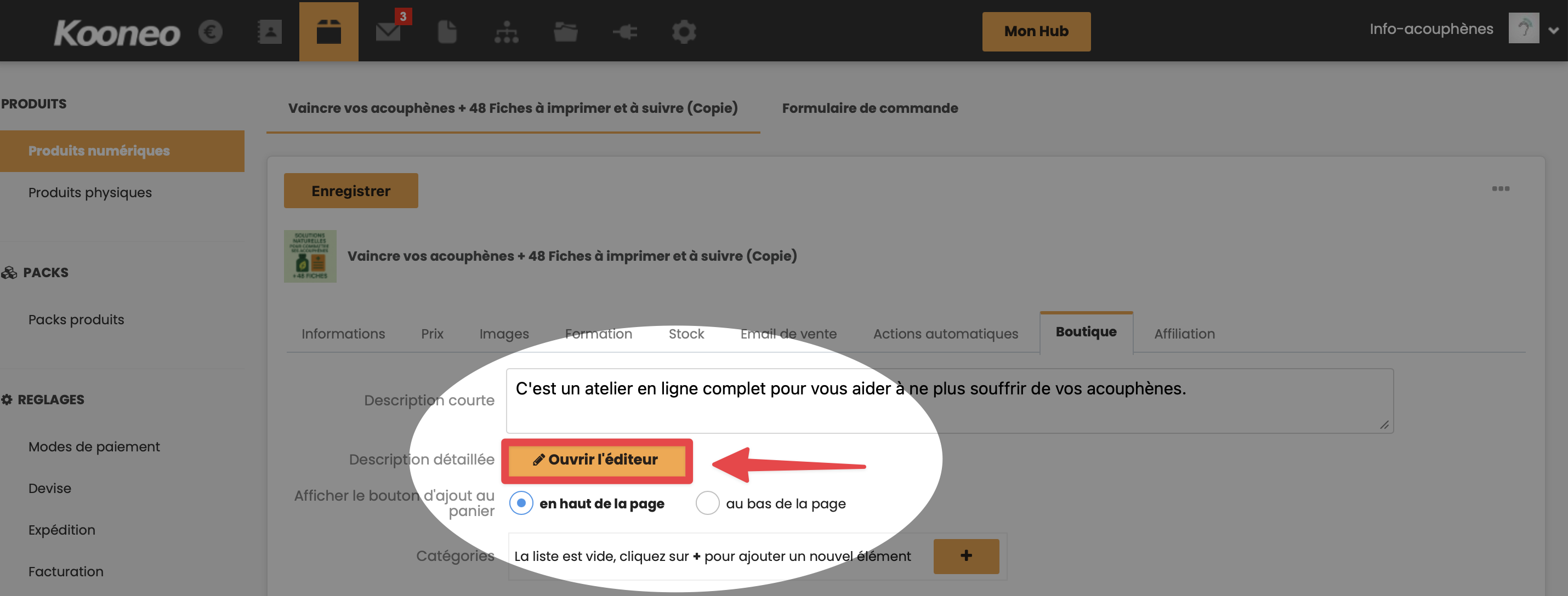 Cette action permet d’accéder à l’éditeur afin de modifier la description détaillée de votre produit, telle qu’elle sera affichée dans la boutique.