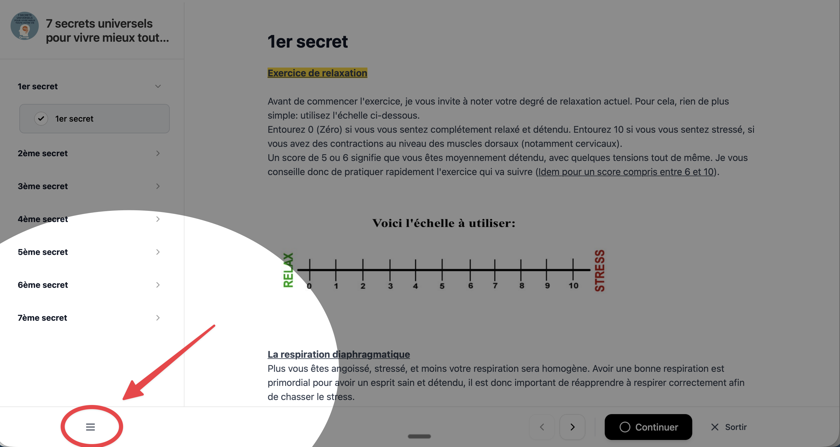 - Lorsque vous consultez une formation dans le Hub, un petit bouton ☰ (trois traits horizontaux) est affiché en bas à gauche.