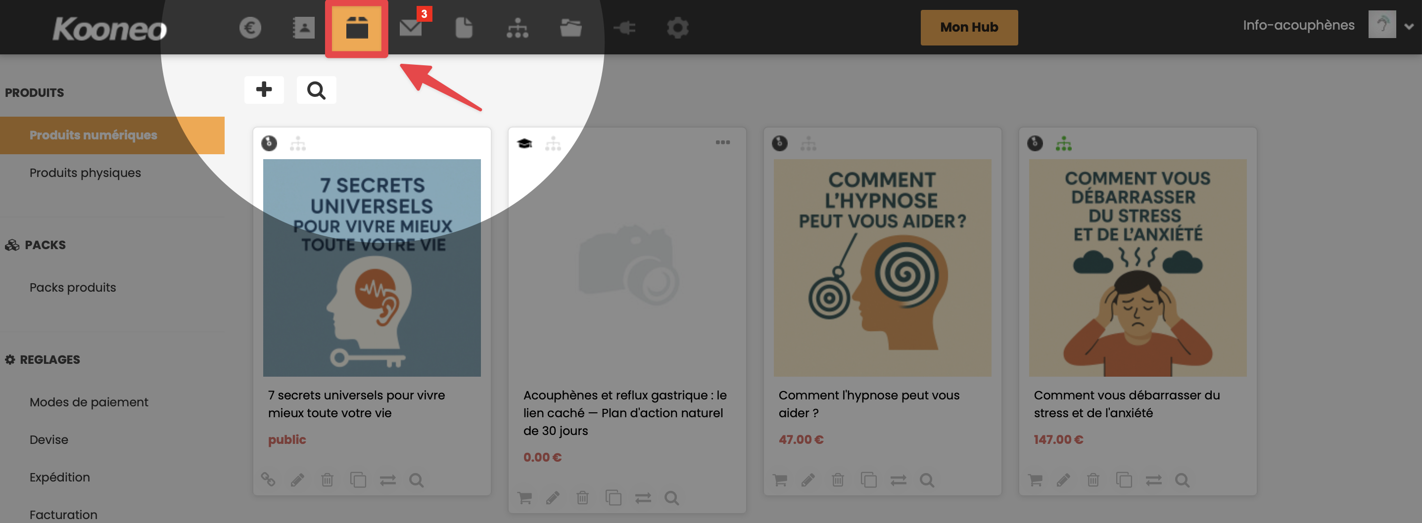 - Cliquez sur l'icône Produits dans le menu du haut