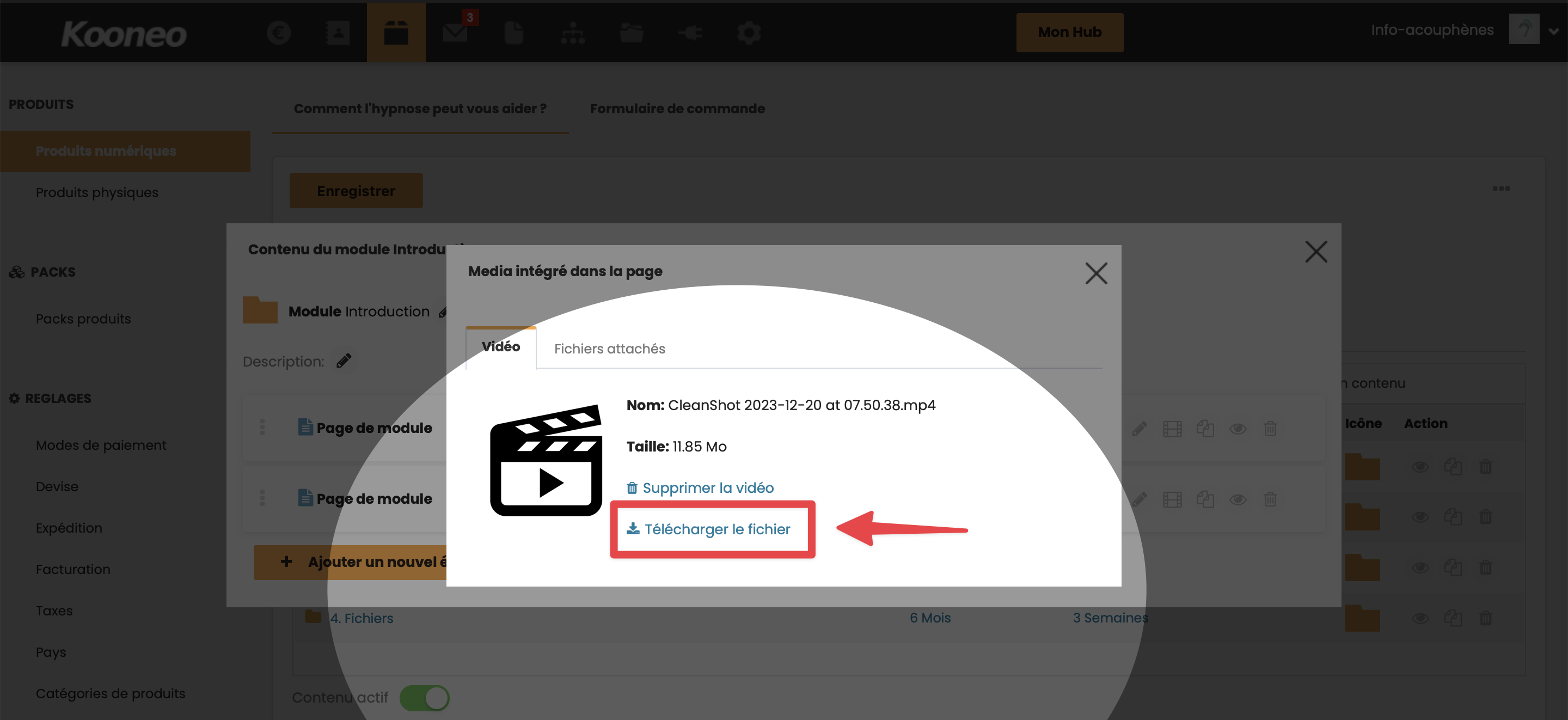 Les vidéos et audios ajoutés via les icônes multimédia dédiées (en dehors de l'éditeur de page) sont hébergés sur Kooneo et peuvent être téléchargés un par un depuis chaque leçon.